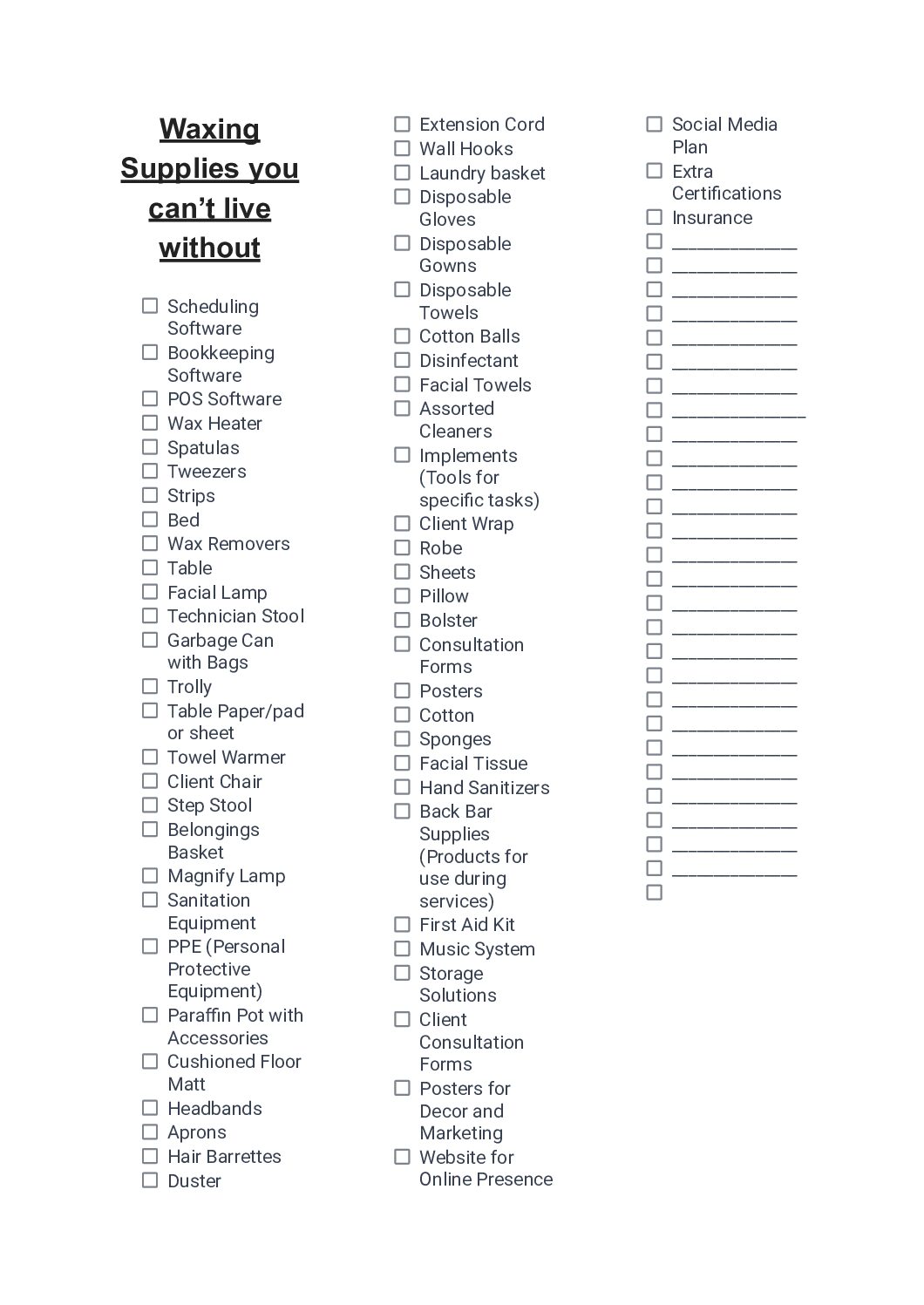 Waxing supplies & List